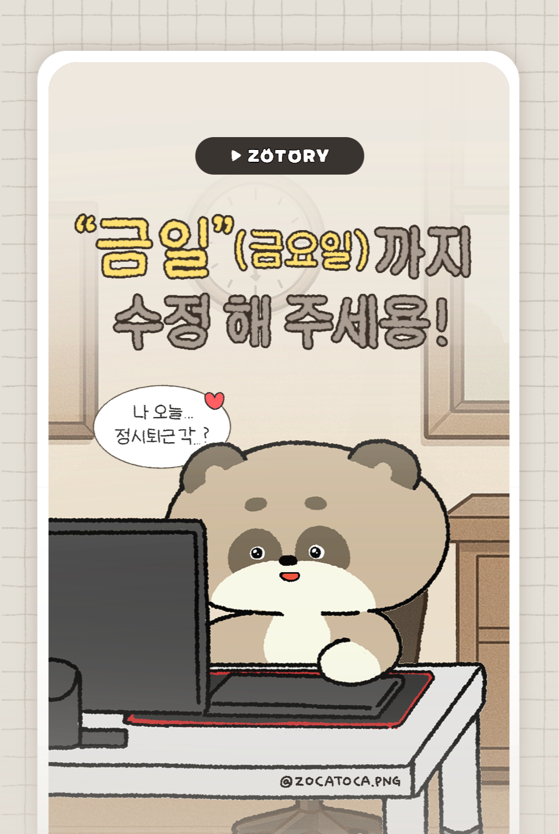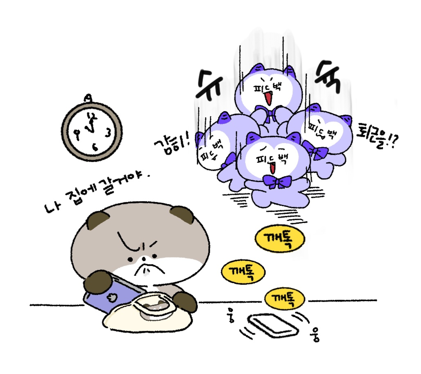 디자이너라면 누구나 겪는 야근. 오늘은 얼른 일을 마치고 집에서 뒹굴고 싶었던 동글이에게 불쑥 날아온 업무 카톡, “금일까지 될까요?” 속마음은 “금요일까지 해드릴게요”였지만, 결국 꾹 참고 “네, 가능합니다”라고 답할 수밖에 없었답니다. 결국 퇴근 후 야구보면서 치맥을 꿈꾸었지만 포기해야했던 동글...